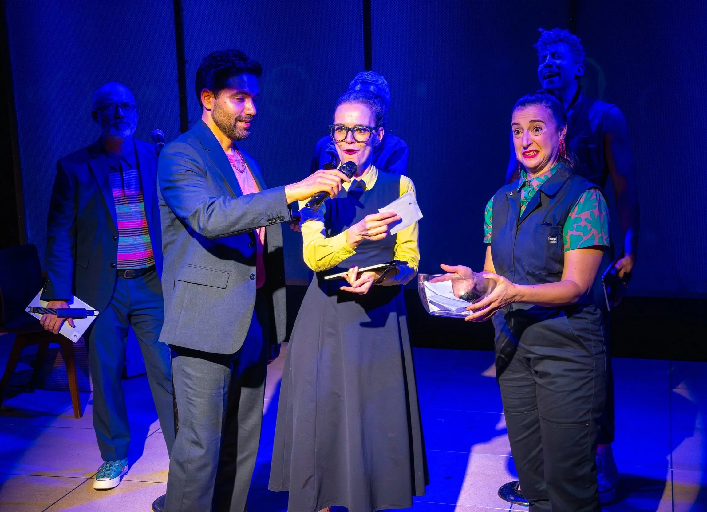 “The cast does impressive impromptu work, singing on the fly and reading live text from hand-held tablets.”